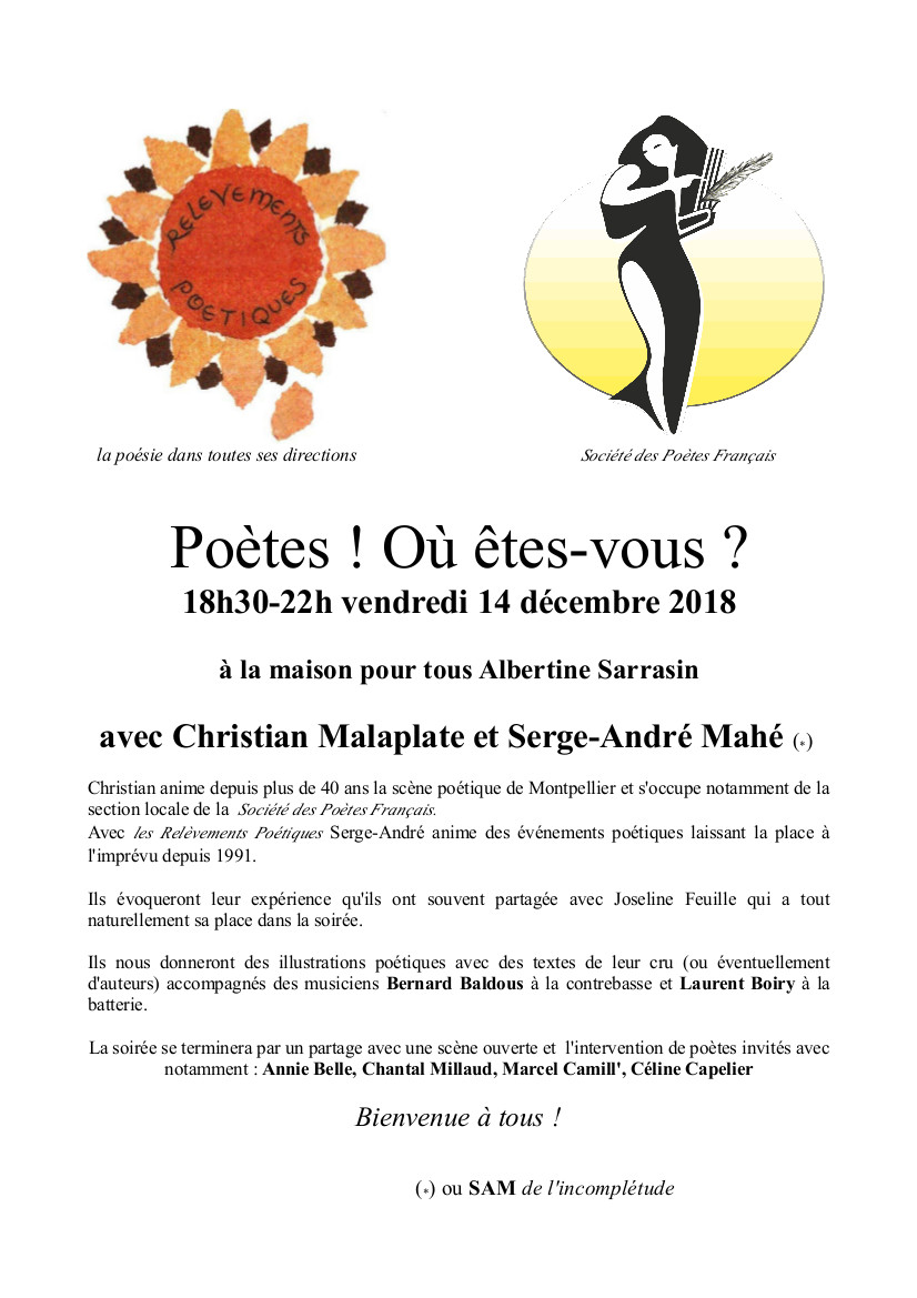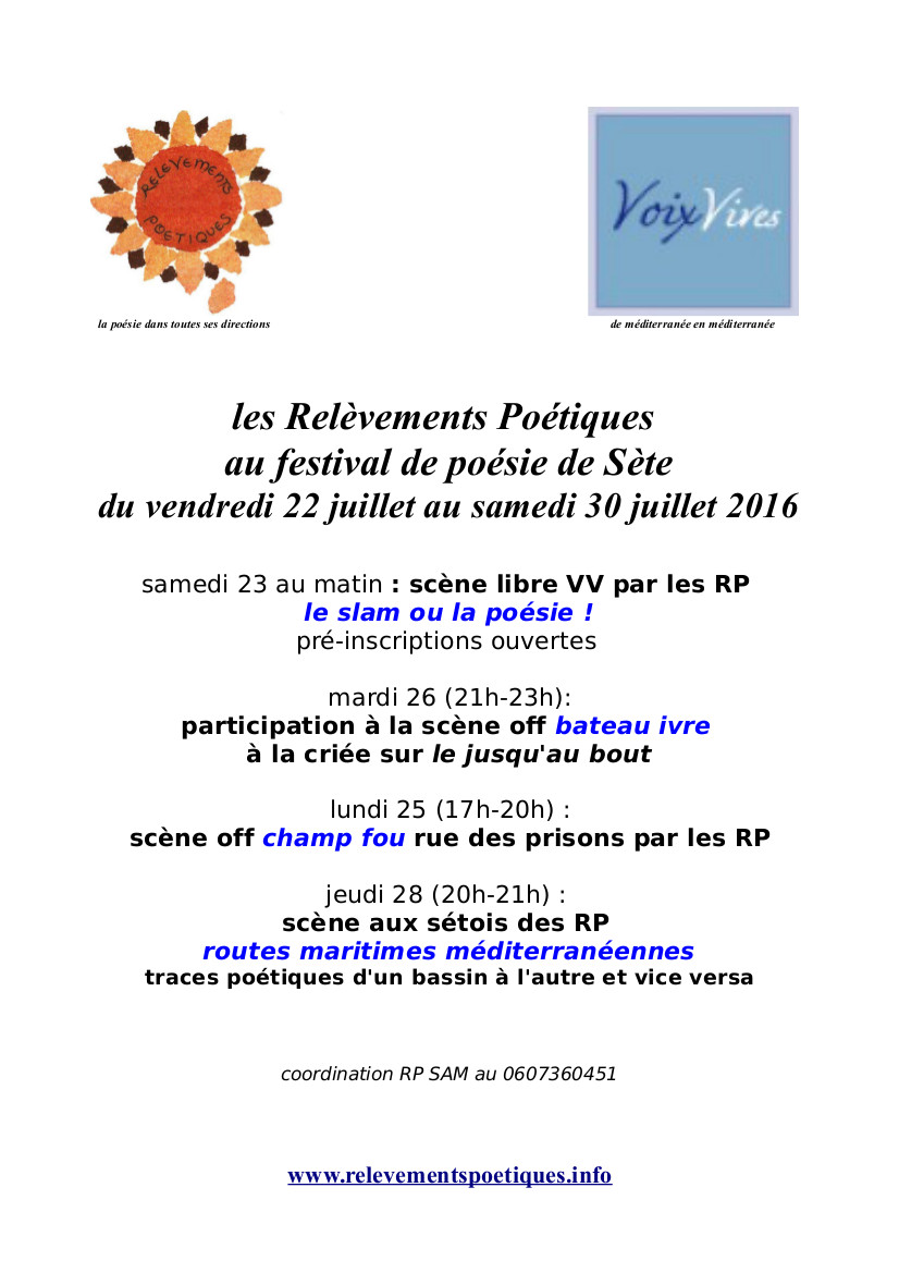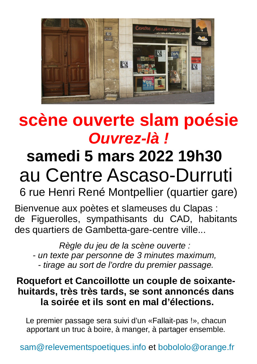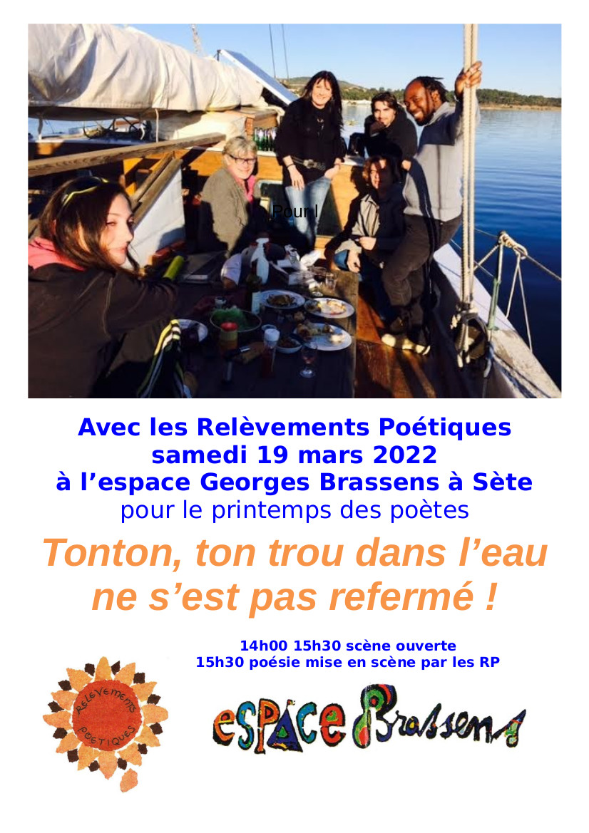 - printemps des poètes à l'espace Georges Brassens à Sète s'inscrire pour intervention sur scène de 15' au 04 99 04 76 26 (accueil de l'espace)