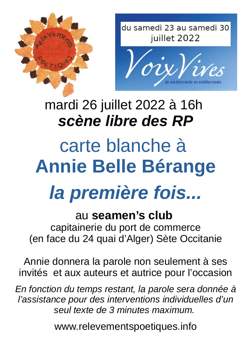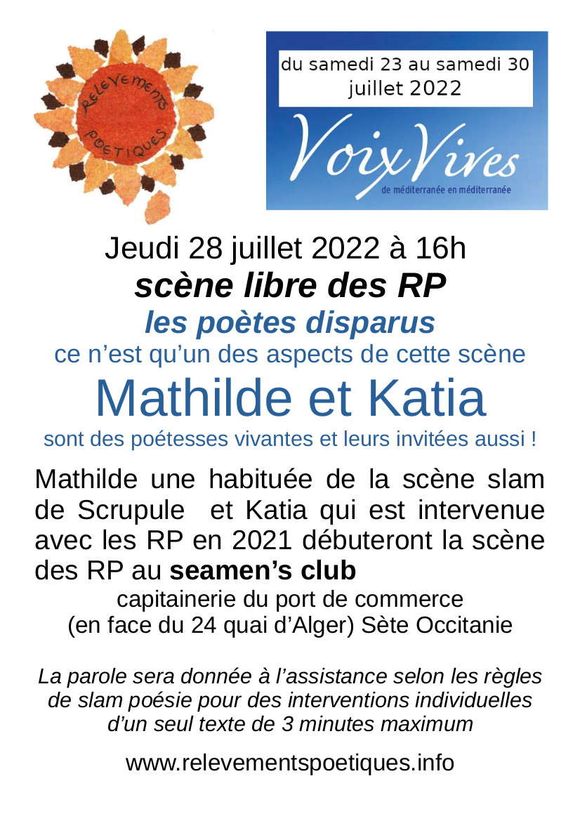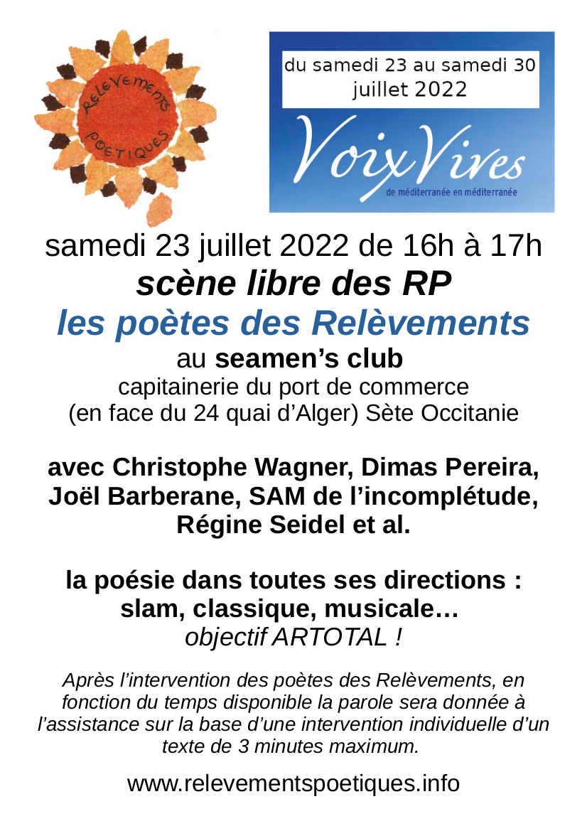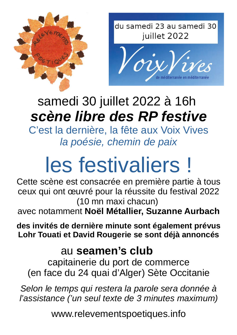 Scènes libres des RP aux Voix Vives 2025 du 19 juillet au 26 juillet 2025 au seamen's club de 16h à 17h30.
