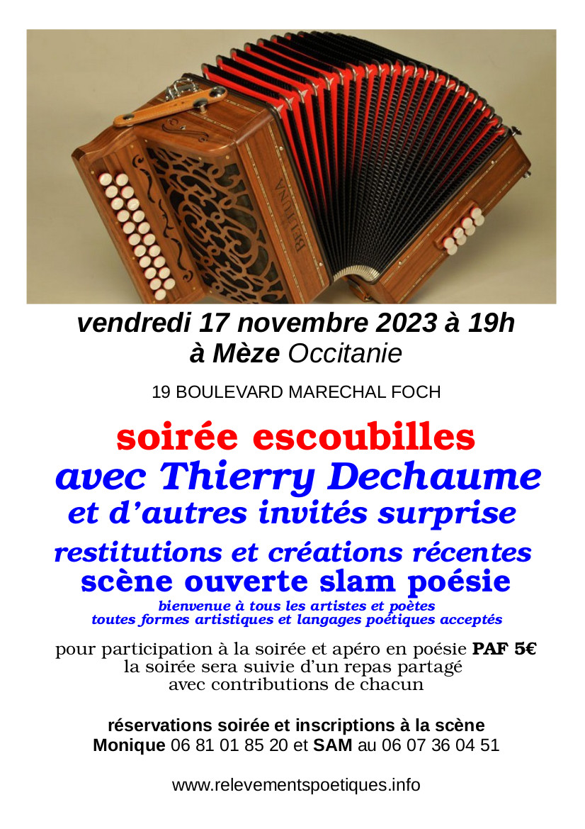 vendredi 17 novembre 2023 soirée escoubilles Relèvements Poétiques avec scène ouverte slam poésie à la voilerie 19 boulevard Foch Mèze Occitanie