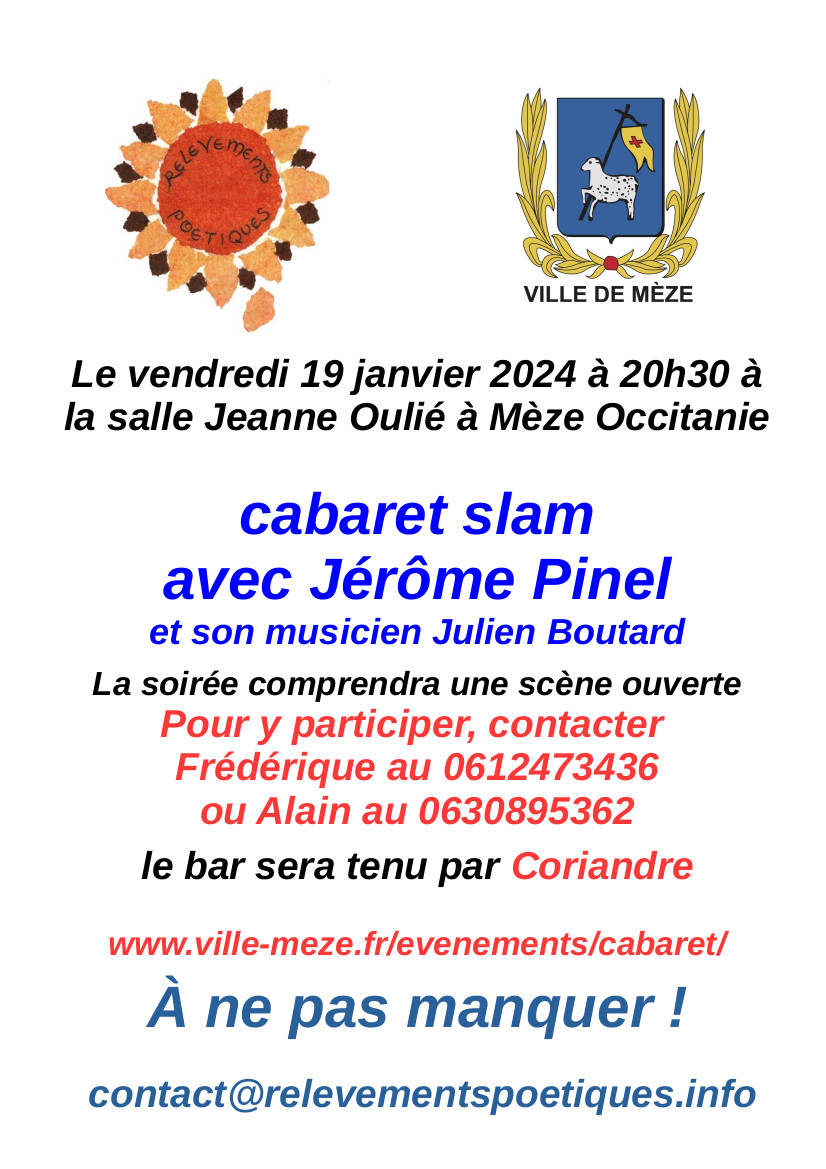 Vendredi 19 janvier 2024 en collaboration avec la mairie de Mèze cabaret slam avec Jérôme Pinel